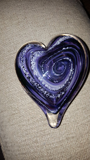 My brother and his wife have been visiting with us for the past few days. Yesterday, my they sat down at the diningroom table and my brother said..."I brought you something"! He reached in his pocket and pulled out a plastic baggie with something that looked like sand in it. On the baggie was written "Dee's Ashes". He had brought me some of my mother's ashes. When my mother passed away, my brother put some of my mother's ashes under the carpet in my nephew's 66 Mustang so she could always go for a ride with him. Well, my daughter was visiting my brother a few month's ago and asked if there were any of my mom's ashes anywhere. I was so excited to have been given the gift of some of my mother's ashes. I immediately took them down to Callahan's Glass Galary. My wife helped me select a glass heart with a purple swirl pattern to have my mother's ashes blended in. Here is the result of that piece of glass artwork. Thank you, Callahan's you have no idea how much this...