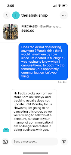 Read moreThey offer skis in their ski shop and also online for eBay this ski shop does not deliver when it comes to ordering their skis . Got scammed by them online after ordering their elan playmakers , they tried to pretend that fed ex doesn’t offer tracking and took me for just under $500 while also not sending me any skis. Now I’ve got to deal with trying to figure out a refund! Tasteless company that ties up your money . He never shipped my skis in the first place cause he had already sold them. ...