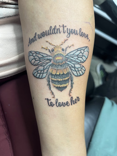 Aaron did my embroidery style bee with lyrics from Rhiannon. I haven’t had a tattoo in over a decade and this was by far my best experience. I honestly was shocked that he accomplished this in a 4 hour session. He took all my ideas and made my vision come to life. Not only am I impressed with the art but the atmosphere. I had such wonderful conversation with all the artists there. It was like hanging out with friends while having a mind blowing piece done. I will be...