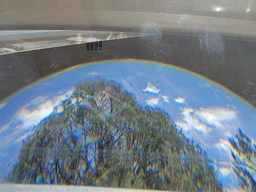 A unique place to visit. There wasn't a lot of information on how to get in or what to do. The road leading up to the school is narrow, so be careful going up to it. The security/visitor center is on the right side of the road. The guy came out to our vehicle and informed us of what the procedures were and where to go. You basically give them an ID and they give you a key card in exchange. They will keep your ID until you return the key card. You take a short drive up to the sanctuary parking lot and then a short uphill walk to the building. The light coming in puts a reflection on different parts of the interior. When you look out the windows do so at different angles. It does change what you see. Notice the rainbow colors at the top of the picture. There is also a rainbow on top of each cloud. Kinda hard yo see in the picture but if you look out at the right angle, it would show. Best of...