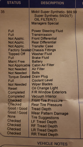 Ā Ā Ā Read moreEasily the best random find I've had when just looking up a routine oil change. They'll be seeing me again the next time I need some auto maintenance. I called and was lucky to get an appointment within the hour. All I wanted was their 69.99 oil change but what I got was much better. Free tire rotation, carpet vacuum and a multi point inspection. They discovered a few things but unlike a lot of places they told me what were priority and what wasn't but put no pressure at all for me to do any of it just yet. I asked for a quote for the work and if I do it I'll definitely check back with them. They even offered if I shop around and bring a lower quote they could try to match the rate. When I left I looked at my bill and besides all I mentioned the receipt also says they topped off my washer fluid, checked my tire wear, inflated the tires as needed. I was very happy to see all of that and I know it's all done because I even have a subtle low washer fluid light that comes on when I start the car and now it doesnt. Appreciate Michael for taking the call and the mechanics for taking care of the car. Will...