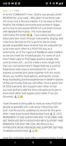 If anyone has any information about specific park locations in Las Vegas community events or farmers markets I am HAPPY to hear about these events, so I can meet new positive people and enjoy learning about the community that I live in.