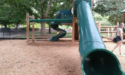 Adorable little park! Slides, swings, climbing, tons of shade, and even a little castle to play in! Sporadic benches to rest on and it's fenced so it's easier to keep track of the little ones. And it's located right across the street from a police station, which is a comfort to me.