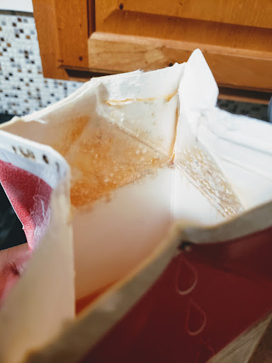 As soon as I opened it, I immediately noticed the paper material from the inside of the carton floating around in the juice itself. Since I was going to be the only one drinking from it, I used my finger to fish out the loose papers hanging inside and floating about in the carton. Once I realized this was going to take longer than anticipated, I opened the other end of the carton. And this end was worse, the reason being was the carton appeared to be bubbling up.