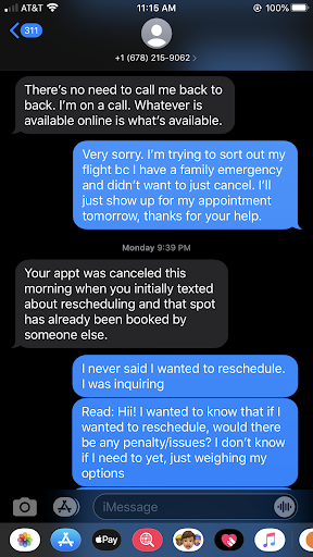 A family emergency came up and I wanted to weigh my options, so I called to ask about their rescheduling/cancellation policy— to no avail. I then resorted to texting to ask them and I typed out a clear and concise message that indicated that I was inquiring only and didn’t intend on changing my appointment at that given time.