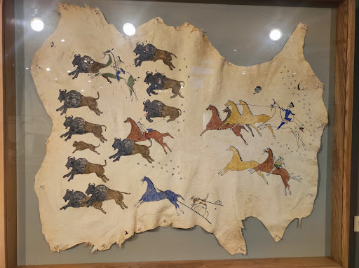 Kids can go into a tipi (correct spelling) and feel all the animal hides from skunk to badger to coyote. They have a buffalo on the floor who's hide lifts up and all the inside parts of it are visible for you to take apart and around the outside on the floor the parts are labeled so you know what they were used for. They can learn how to lasso a model cow and practice. They can put together letters on a magnetic board and make their own brand for cattle (see photo). They can go into a general store, pick up a basket that has a grocery list in it, pick up a bag of money and fill up their basket while inside and pay at the register. They can make a bead pattern with what looks like checkers on a board representing beadwork by the Kiowa Indians. You get the point. SO much to do, so awesome and fun for kids!