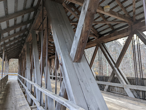 Read moreThe covering on this bridge successfully keeps its surface free of snow. The bridge allows vehicles and pedestrians to traverse the Mascoma River. (Effectively single-lane, but good enough.)