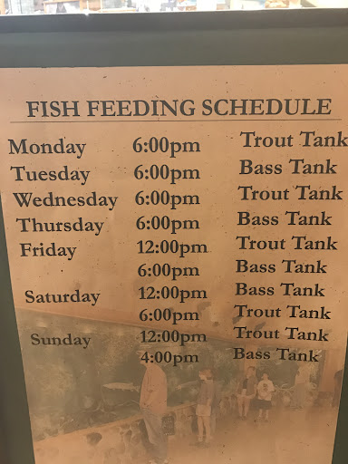 Read moreAs a Mom I go here for the free or cheap kids entertainment. It is always amazing to see the big tanks of fish and see the different varieties of fish. I have only seen them do the tank feed once but it was super cool to see the big fish chase after the smaller live fish that were used as food. Seeing up close how they feed was very educational and fascinating. My kids love the target shooting that has actions/sounds if you hit the target. Having food to order in the store is a good idea as well cuz you can spend hours in the store just looking around. I love the roasted nuts and getting a free sample of 1 of the 40 flavescente of fudge is a yummy treat for me. During a previous visit I received great advice/ assistance and service when I was considering using a fly for the first time instead of a sunk line with bait. I usually buy mostly food items but I loved seeing a few t-shirts priced under $10! I love the one I got- it has great length! And since my hat was looking a little trashed I was happy to find those for $7.99 as well! My kids were happy too that I finally bought them each a popping gun since they were playing so actively with them in the store. I went away happy. It's always special to...