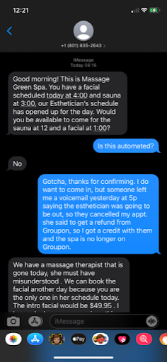 I bought a Groupon for a one hour facial + one hour infrared sauna session a couple months ago, and I called, hoping to book within the week. No one answered, so I left a voicemail. I didn't get a response for four days, so I called again the following week. They didn't have any openings that week but booked me for the following. I normally never really reschedule, but I had a work schedule conflict and also got sick another week. Both times I called, no one answered the phone despite it being during business hours. Some days, I would call every hour to see if someone would pick up, thinking they're just bad at checking voicemails regularly. This was not the case either -- I have never encountered a spa that doesn't have someone pick up throughout their whole work day. Jennifer was usually the person to pick up. She is friendly and rescheduled me when I needed to, but you never know if or when you are going to get a hold of someone. There were times where we'd speak then she'd call me back following up on a voicemail, not having any idea we had already spoken within the day. I was finally supposed to come in today (I confirmed via text yesterday morning), but then I received a voicemail from the spa yesterday at 5pm, less than 24 hours before my 3pm appt today. She didn't leave her name (it wasn't Jennifer), but she said that the facial esthetician, Susan, was going to be out. Fine I guess, but then she says that they went ahead and cancelled the appt. I'm thinking, why didn't you just offer to reschedule me?? Then she says that I should just contact Groupon to get a refund and then closes with saying that the spa may be closing (permanently). They didn't ask for a call back, so I didn't. I contacted Groupon yesterday but so far have only been able to get a credit, not a refund. I'm super bummed because I can't really find any other good places on Groupon to get a facial that are within a reasonable distance. Surprisingly I received a text from the spa this morning (pictured) asking if I wanted to come in earlier for my scheduled facial.... uh, what?? I wasn't sure if it was another automated text like they've sent before, so I asked, to which they said no. I told them about the voicemail I had received the day before, and they said the person who left the voicemail must have been mistaken. They didn't offer any sort of discount despite the hassle and contradicting communication, so I declined coming in at all. I really want a facial, but it doesn't seem like they have their sh*t together. Sloppy service. Disappointed. I guess I'll take it as a sign I should stay away from this place.