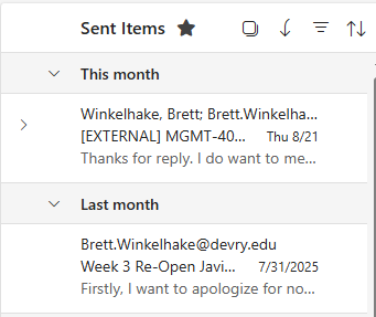 Read moreThis review is strictly for professor Brett Winkelhake MGMT404. Not Devry University. The issue I have pertains to my overall experince with him not the course. My issue stems from one test in which I had failed to do in time. Due to the fact I work 2 jobs and have a full time dad position at home. I Immediately reached out to the professor in reagrads to reopening the the module. I kindly explained my situation and pleaded that it would not happen again. I just didnt want my grade to take such a hit. It being work alot of points. Mind you this is week 3, my other assignments all had recieved full points and my discussions were always up to if not exceeded the standard. I didn't hear back from the professor for 3 weeks putting us in week 6. He states he never read my plea in time, (3 weeks later) but now its too late. There is nothing he can do. My efforts were wasted on a course that I could have passed with an "A" but didn't all because "he didn't read it in time". He has been the only professor to not reopen a module for me in my 5 years at Devry. I am very displeased with my grade because I worked hard till now maintaning and growing my GPA and it will definitely take a hit with this "B" in his course which was MGMT404. I hope Devry replaces Professor Brett Winkelhake with a new professor, one that reads their email & comments in time and can make a legitamate and conscientiousness decision. Not just "didn't read it in time and theres nothing I can do about it." These are peoples grades and futures at stake. We deserve a chance to do the best we can. Up until now all my previous professors have been amicable when I would reach out and explain my situation, some points would be taken off but I would still get the chance to make it up. Not just "theres nothing I can do" What a idiotic answer coming from a Professor for that matter. All my efforts in his class are wasted to a "B" because he didn't see my plea in time. Below is proof I reached out in time and his response date. My grade should not have to suffer because his negligence. I'm very dissapointed with him. Professor Winkelhake MGMT404. DO BETTER!! STOP PLAYING WITH...
