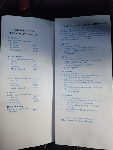 Read moreI absolutely LOVE this place. Granted, yes it's a little pricey, but WELL worth it. They keep up with the bulbs, making sure they're still "tanning" the customers. Everything is ALWAYS so clean and fresh, plus they have the cutest clothes and shoes and beach bags, and much much more, but what keeps bringing me back is their friendliness!!!! Some places you go to the employees make u feel uncomfortable, or are "stuck up", but not at the Caribbean, they are ALWAYS very friendly, warm, and inviting, and that is very much...