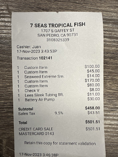 My 2 star review is mainly about price. Kind of outrages prices when you compare to everything you can buy online or Amazon. To the owner: bring your prices down a bit and you’ll get more sales. I’ve seen some reviews here and they also say your prices are high. There’s no doubt that you guys know your stuff but the prices are extremely out of control. The same GFCI outlet adapter I got from you costs $20 on Amazon and you sold it to me for $80. That’s kind of a rip off. I get it, you have a specialty store and need to pay rent. But wow. Also, the Aquatop SP-9 UV was way over priced. You sold it to me for $170 plus tax and I can find the same one online for $70-90 bucks. I don’t think I’ll be going back. I checked your receipt and it says “all sales are final”, so I won’t even bother calling you or going back. I’ll just make a public review so other people are aware of your prices so they can make a better decision. Competition is tough I know, but I also saw somethings you have for sale at your store that you can buy the same exact items at a Petco for about half the price. Long story short man, I was impressed by the knowledge y’all have but the prices need some adjusting. At least for me and many others that have said the same. Nice store and great fish though. Don’t think you’ll see me in there again. I’ll post a picture of my receipt just so it backs up...