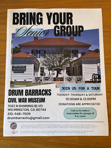 The Last time I went was years ago, and I just want to say that this place has a lot of history behind it and if you want to know more about the history of Wilmington Ca. and know more about Phineas Banning and all this indeed is the place to come to for a plenty of history about Wilmington as well as the Drum Barracks Museum. It is really a neat museum as well as you can really learn a lot about this place and how Wilmington was founded and about this wonderful Museum. So if you would like some history about Wilmington Ca. and all Please come here to the Drum Barracks Museum you will get a lot of history as well as learn more about how Wilmington was founded. Please come here it is great. I also got to sing here for the founding of this place years ago and I was glad that I got to sing when this place was refounded. Thank...