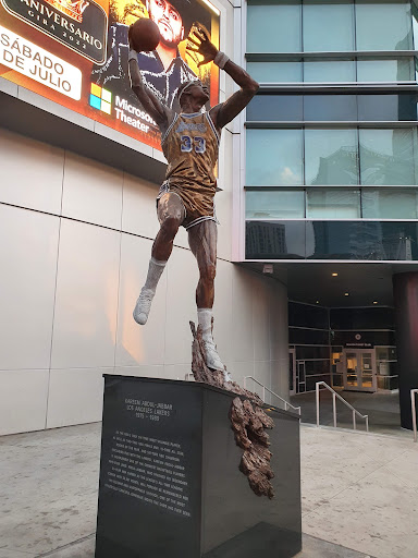 A statue of basketball player Kareem Abdul-Jabbar by artists Julie Rotblatt Amrany and Omri Amrany is installed outside Los Angeles' Crypto.com Arena, in the U.S. state of California. The bronze sculpture was unveiled in 2012. It depicts Abdul-Jabbar shooting his patent skyhook shot.