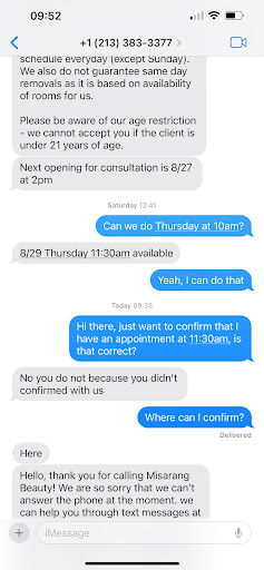 To make matters worse, they took pictures of me without my consent while I was lying down with numbing cream on my face. I had to let her know that I don’t give my consent for them to use my photos. The receptionist texted two photos to me while I was there waiting for my procedure with generic aftercare instructions — again, with no explanation or personal attention.