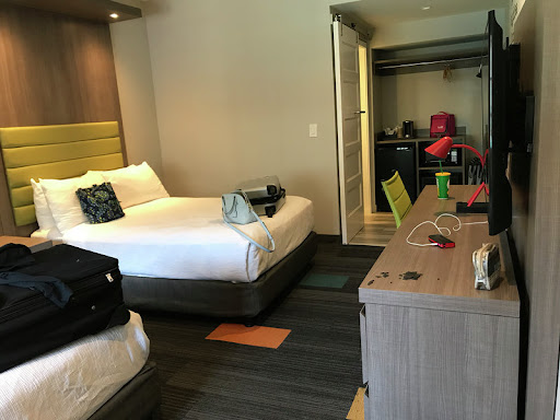 My room was absolutely adorable and super clean! The place has obviously undergone a fairly recent renovation to bring it up to speed with modern economy options like moxy, element, and aLoft. The many lighting options to choose from were fantastic, there was a breakfast nook in this king-sized room, in addition to ample desk space and very smart use of the space in general. A microwave, mini fridge, and single-cup coffee machine with Wolfgang Pick brand disks and a choice of two hot teas were provided in the "kitchenette" area. Outlets and USB plugs were everywhere. A large flat screen was mounted on the wall, with direct HDMI inputs beneath it so I could have plugged in my computer to watch movies if I'd wanted. The open closet space was smart and included a new ironing board & iron.
