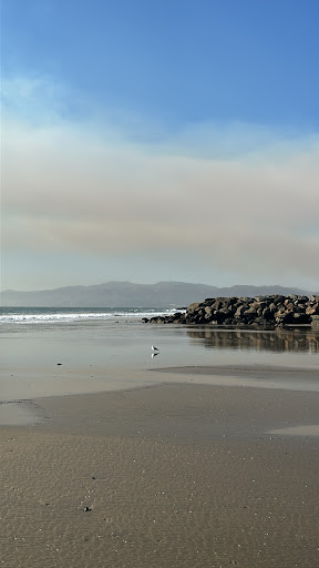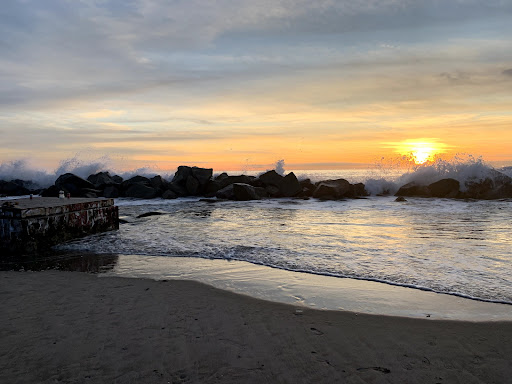 Storm drain leading out to the rocks is covered with very slippery green algae. During higher tides, waves do break over the rocks, so be mindful if your going to climb on them. Quite a few folks have gotten hurt when crashing waves wash over them.