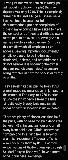● refusal to give any way of contact to owner of park/ higher up not even their name! I am still attempting to find this information. ● make physical and virtual documtation of EVERYTHING.