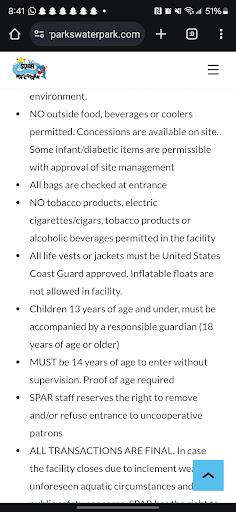 In the supervising of a public facility in which the proprietor makes these kind of rules is of prison/incarceration management. From that moment on the whole experience of the Sulphur water park was that of prison incarceration management. The young immature staff with ego’s bigger than their own presence began to emerge. They have been trained that the residence of Sulphur Louisiana, and non -residence of Sulphur are four legged mentalities in a two legged body suit that need to be controlled in every action while being in the water, and off the water. This is a prison mentality manage facility which does not allow people to think for themselves within the boundaries of the rules. They have been trained to over step the hospitality industry of paying your way to swim for a while. One slide was closed due to pole that was mounted on a cement block fell off, and a sign was posted about that incident. It’s still not fixed, and they still are allowing people to go up the steps because that slide is connected to the rest of the slides being held up. This place is a big liability, and could fall apart any time any day. It is to my shock that Sulphur will endure such a label as no brains they will think for you. It shows to me that the people from Sulphur are willing to endure a prison management just to swim. Trained people count. Hospitality is a memory of sweetness, and kindness. The staff can have the same rules, but in kindness enforce them. Since they know Sulphur residence are four legged mentalities in two legged body suits. The approved conduct is that of drones not humans. The devolution of the mental structure of Sulphur residence to produce a water park run this way is shocking. Schlitzerban and Blue Bayou have one priced scale for all people who visit from all around the world and here in USA. Even for the season passes, they are a set price to use THE WHOLE facility. Plus Blue Bayou even includes their theme park. My experience of Spars Water Park is a discriminating, price gouging monstrosity, prison management of Sulphur residents only. The customers are treated as caged animals, prisoners, drones and used for mistreatment by the staff. It would appear this is a precursor training camp for future young leaders for Nazi type leadership. And if I did not know better, the owner has an ulterior motive, the grand experiment. The MSU students majoring in psychology should take a summer visit to observe at this park and discuss how this place is run! C.F. Volney states, “power back to...