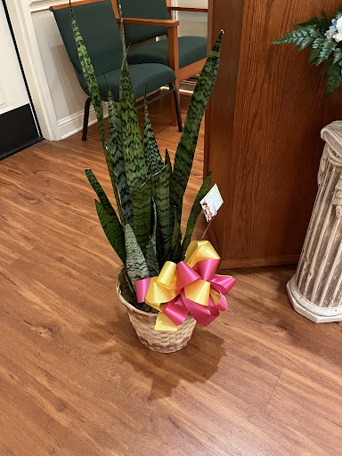 I had the occasion to purchase a plant for a dear friend whose mother had passed away after a long illness. I didn't want flowers, I figured there would be plenty of those, but something she could take home and be enjoyed by her, her husband, and daughter. After narrowing down the wide choices of sympathy plants Nanz and Kraft offered, I chose the snake plant. I had read about it in the past - it was low maintenance which was important. Now of course I had to base my choice on the image on the website but was happy with the price range (funeral plants/flowers are expensive anyway), and with the special requests, asked if - if available - they could use pink and yellow ribbons, the decedent's favorite colors.