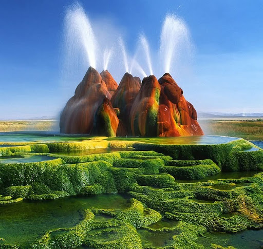 Fly Ranch Geyser, located in the Black Rock Desert of Nevada, is a man-made geothermal wonder that originated in the 1960s due to an accidental drilling mishap by a geothermal energy company. While attempting to access a power source, the workers struck water that was too cool for energy use and failed to seal the opening properly. Over time, the geyser began spewing hot water and steam, forming the vibrant and colorful travertine mounds seen today. The brilliant hues of green, red, and turquoise are the result of algae thriving on the mineral-rich deposits.