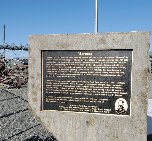 Briefly, Marzen was a mining town near Lovelock that was destroyed by an immense wall of water from a heavy downpour in the mountains above. A recently dedicated monument provides more details, thanks to the local chapter of the historical fraternity E Clampus Vitus (ECV).