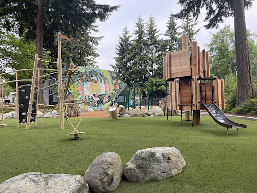 Read moreClean, new feeling and lots to keep the little ones entertained. Swings, slides, climbing and spinning equipment. Great bathrooms. Clean and no bad smell. Walking/ biking paved trails. Access to the Interurban trail. Covered gathering area. Picnic tables and charcoal grills. Tennis and basketball courts and a fenced in area I thought was an off leash dog area but the sign says no dogs. So maybe for toddlers ?