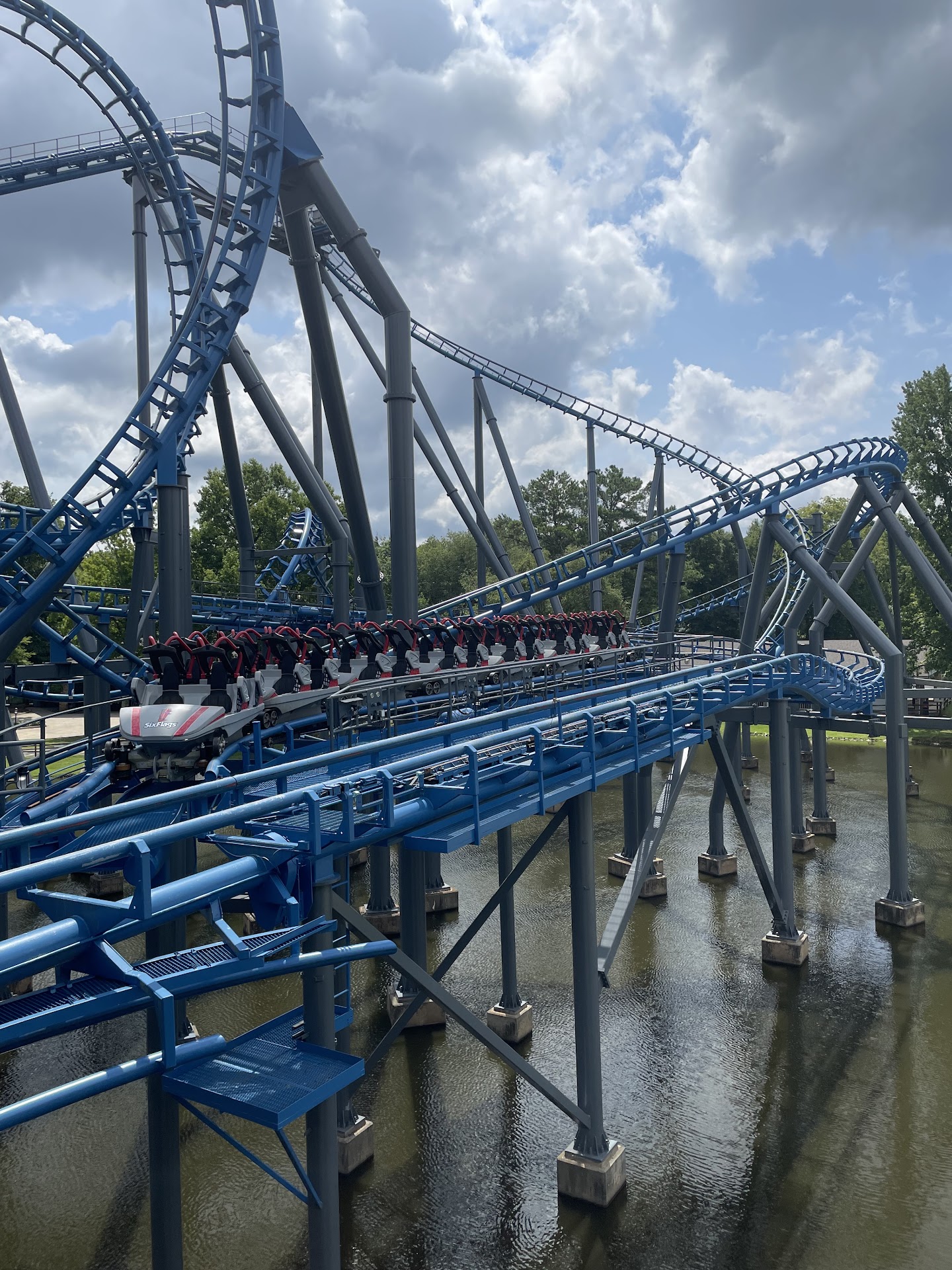 It looks very intimidating but once you are secure in the restraints it makes it so much more enjoyable if you are afraid of coasters. It still scares the mess out of me especially that drop and pretzel right at the beginning but it is truly awesome and I wouldn’t have ridden the others if not for it. I also don’t know why people comment that it is rough because I found it to be soo smooth even in the pretzels but especially in the inversions and corners. I was originally going to ride the Riddler first but after riding Blue Hawk, I found the Riddler much “scarier” and certainly more uncomfortable.