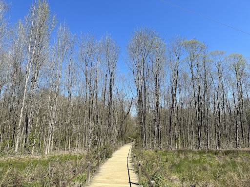 The first part of the trail has a bench and runs past some patches of flowers and ponds, then goes on to an elevated boardwalk that passes through a low wetlands. I have seen a rabbit and several squirrels running alongside the path in this area.