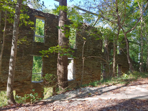 At the end of the boardwalk is a bridge crossing Nickajack creek, which provides a nice view. A path leads away form the bridge to the right to meet up with Fontaine Road and the Heritage Park trail continues to the left. This trail follows Nickajack creek and passes across several small bridges and picturesque scenes, then reaches some old burnt-out ruins. At the ruins there are two picnic benches under a pavilion, a small path to the covered bridge on Concord, and two paths leading steeply uphill to the Silver Comet Trail.