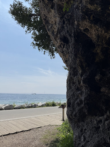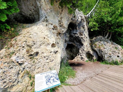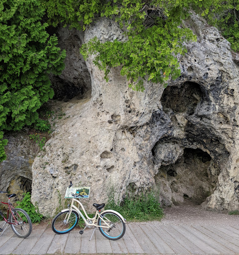 It's just a rest, stop along the 8.2 mile loop road. Just basically an interesting rock formation with smoke stains from when Indians, soldiers or pirates through the centuries past stopped to camp and cook under a shelter ledge. Probably the least interesting feature on the island. I was more entertained by the squirrel we saw while we took a bicycle break. Yes, those are our 🚲 in the picture. Take your own bicycle, it's worth the $15 ferry fee to have wheels when you need them. Bike Rentals are expensive and only make sense if you are just on the island for a couple hours. If you're staying on the island overnight or for the week just take your own bike and a lock, helmets are...