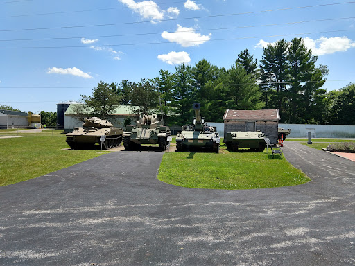 Outside of the main building, there is a large grassy area that has several pieces of large military equipment.