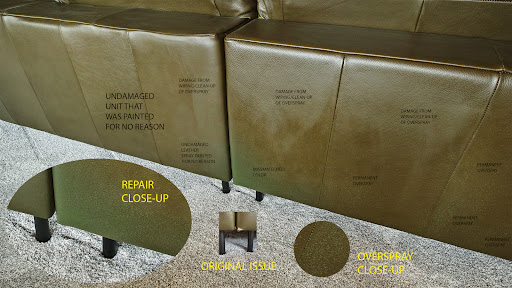 We invested so much time in finding a unique piece of furniture we truly loved. We paid thousands of dollars to have it damaged not once but twice. None of which compares to the frustration and lost time post-purchase. Now, we are left with a spray-painted couch that has mismatched colors and white residue all over it. Not only our concerns were not taken seriously, but our hopefully uniquely negative experience and objective evidence were essentially ignored. Instead, we were given generic non-answers that may as well have been cut and pasted. While she finally acknowledged our frustration, she never admitted that this was not a âperfect repairâ and how much of a waste of time, energy, and trust this purchase has been for us.
