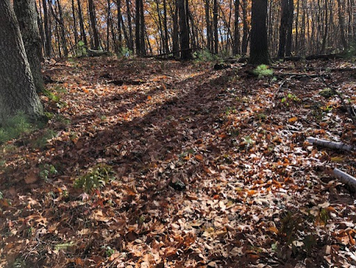 The second trail is the woodland trail, which you can get to from the all-person trail. It's a much larger loop through the woods, and the trail is more like a deer path and not a wide, groomed path. The gradation of the trail varies quite a bit, so I recommend good shoes and water. The trail is marked by small arrow signs placed periodically to indicate direction. Halfway through the trail there is also a side loop that you can go down into that takes you to a rhododendron area. It's really beautiful down there and I can't wait to see it in the spring. The woodland trail does not have any benches or other man-made areas to rest.