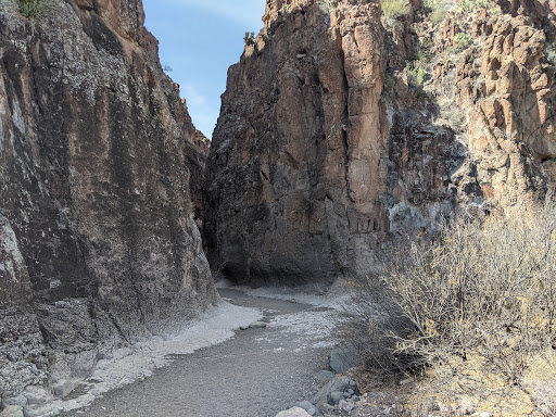 The geology in the canyon is pretty cool and it's very narrow. Much of the rock is pretty slick from erosion and there's a good bit of loose, fine gravel that made sections a little precarious folk folks with limited mobility. Feels a bit disappointing that you get to a point and a sign says turn around and go back. I'm ASSuming the canyon drops off too steeply to the Rio Grande and the State is keeping us all safe.