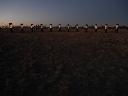 Read moreOn the way to and from the Marfa Lights Viewing Center, an arc of illuminated steel pillars beckons you to pull over for an encounter with their an assembly of glowing forms. The artwork—open to the public and free to visit—invites you to wander among the tall columns and wonder at the peculiar, playful images. Viewed at night, they shine like aliens from inner space who emerge from the blackness of closed eyes. Visit at sunset or sunrise to see their colors changing against the changing colors of...