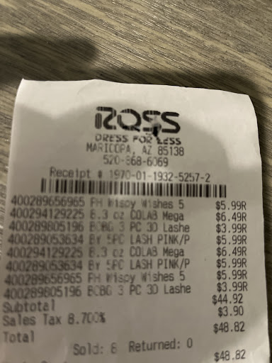 Read moreI like this store. The employees are very nice and helpful. I had purchased a faux fur throw at another location an hour away, where the cashier failed to remove the anti-theft device, and I came to this store to shop, so I asked the cashier if she could remove it. I had my receipt, thinking it was the correct one in my haste, however it was for a different throw I had purchased at yet another location. She did the right thing and first checked with her superior, who allowed her to remove it. While most cashiers would probably have just told me "You must have your receipt" since it's easier, this kind cashier went above and beyond to ask, and I was very pleased that gesture saved me a lot of hassle. While this is on a different subject, I wish all stores, including Ross, would get with the times, technically, and keep a record of purchases on one's debit card... the way Walmart and Home Depot does, for example. Those stores know everything I buy with my debit card, saving the inconvenience of needing a hard copy of a receipt when I return items. And I don't recall Ross asking me if I prefer my receipt emailed... but next time, I'll definitely ask! Let's...