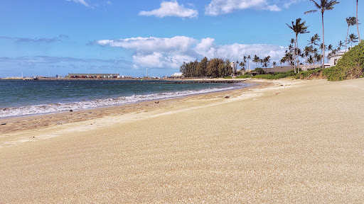 THE PARK: Hoaloha Park is about two acres in size, with a sandy beach and very protected waters as it sits in a bay shielded by Kahului Harbor and a manmade peninsula. Grassy areas are expansive and stretch from the Maui Seaside Hotel border on the west end to the former Chart House and Hideaway Restaurant (still vacant building) to the east. While there are facilities such as restrooms, it's not available to the public as they're inside of the canoe club's buildings. Being literally next to Kahului Harbor, I wouldn't suggest swimming here as the amount of ship traffic simply pollutes the waters. Come canoe season, they sometimes hold regatta races here and the area gets infested with people and cars.