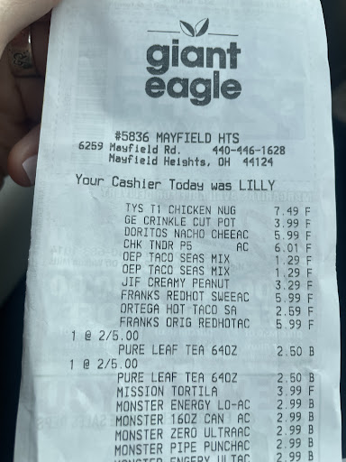 Read moreThis is by far the most poorly operated Giant Eagle I have ever shopped in. I frequent it only because it is so close to home, but I rarely can even pick up just a few items without some kind of mishap: "Sale" signs with the wrong item in the bin they are labeling, many out of stock items on the very first day of a sale, standing in the meat/fish department forever waiting for help while someone on the other side is just wrapping meat and makes no eye contact with you. I have even said, "Excuse me, is someone working this department?" and gotten, " Just hold on a minute Ma'am!" for a reply! lol And watch your expiration dates!! I have found yogurts, Pillsbury biscuits, hot dogs, bagged salads and more WAY overdue. I pointed this out to a manager and they just took the items out of my hand and said they couldn't sell them to me. (Yeah, I wasn't planning on purchasing them!) And now they're replacing more and more of the name-brand items with "Giant Eagle" brands. There is another G.E. not so far away at Legacy Village that doesn't carry as much stock but is much cleaner and well organized. Worth the extra gas if you have to shop big. Appreciate this space to vent and shout out a warning to other shoppers! PS The only reason I gave this store one star is because it wouldn't let me post with NONE. P.P.S. I posted the above review months ago. Just a little update. My husband went there today for the "10 for 10" Dannon Lite Yogurt sale. ONE flavor. ONE. Strawberry Cheesecake. So if you don't like Strawberry Cheesecake guess you're out of luck. Suggestion: Change the big sign outside from Giant Eagle to Giant Fecal because that pretty much describes your inventory, customer service...