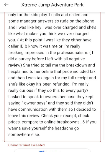 I had reserved a party for â10â because thatâs what the employee had told me to do then change the amount on kids depending on how many arrived. I told them I was expecting around 30-40 kids (plus parents) & they told me the same amount of tables is given from 10-40 kids reservation. I asked the manager how that was possible and his response was â weâve never had any complainsâ so this is a complaint. They didnât allow taking in food or drinks unless you pay $150 but if you pay the $150 you couldnât take pizza in anyway because they sell that there. We decided to just purchase everything there when the host came to ask what we needed I told her I wanted to start with 8 -2 liters ( they only offered coke and sprite) they only brought me 5 and told us they ran out. I asked if I could go buy some they said if I paid $100 to take some in!!!!! I was in disbelief. I went to talk to manager and they sent someone to buy some (took about 30-40 minutes) my guests were thirsty. They said they would bring ice as well. After 40 minutes they brought out 3 cokes and told me they didnât buy sprite just cokes. They were hot so I asked for some Ice ( another 20 minutes to get) and they brought them in rectangle containers. I asked how were we supposed to serve and the lady said â I donât knowâ I ended up using a cup I had brought in. As more guest showed up some started using the table next to us to rest since it was empty and they said it was for the public , they said my party guest couldnât use it. I could not believe I was hearing this. They had told me it was $50 for half the table - $100 for the 2 tables. ( itâs 2 tables turned into one longer one) I was extremely overwhelmed how the whole service was I kinda just stopped being so worried and tried to enjoy my daughters party and then they came and told us the table next to us was going to be a part of a party. My husband then said if we could pay for the half table ($50) our guest were using so we wouldnât have to tell them to move and they said no it was too late. After talking to the 3 managers they said we could pay for it but we had to pay $100 for Both and I said I wasnât using the other half why it was an option to pay $50 if they said â it wasnât fair for the other partyâ but what they failed to see is how they werenât being fair for me. The manager was like âyou only had 15 kidsâ & I was like no I have â32â and she goes well regardless itâs the same tables for all parties. So I asked her how they were expected to fit and she said â since the package is only for kids table is for the kidsâ so basically they arenât accommodating parents and suchâŚ. But we have to pay for the food and drinks for parents and they donât get a place to sit? Overwhelmed and all we ended up moving to our tables did cake, paid, & left! I was so embarrassed because I didnât even know half my guest since it was classmates in my daughterâs class I had never met. The receipt didnât seem right to me so I went online to check the prices and I looked out the breakdown online how they charged and I was able to see the full price for my amount of kids and taxes were included with the price and then on my receipt they taxed it again so an additional â $60â of extra taxes and that was only for the kids play. I calls and called and some manager answers so rude on the phone and I was like hey I was over charged and sheâs like what makes you think we over charged you. ( At this point I was like they either have caller ID & know it was me or Iâm really freaking impressed in the professionalism. ( I did a survey before I left with all negative review) She tried to tell me the breakdown and I explained to her online that price included tax and then I was tax again for my full receipt and sheâs like okay itâs been refunded. Iâm really really curious if they do this to every party? I asked to speak to owners because they kept saying â owner saysâ and they said they didnât have communication with them so I decided to leave this review. REMAINING OF REVIEW IN...