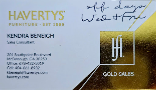 Read moreTwo months ago, my son, daughter-in-law and myself came in. Immediately, Tanya Bass welcomed us to the store and how can I help you. Selling home and downsizing with a New Journey. She was very professional and happy to help pick furniture! I purchased furniture for 1bdrm and it feels like home. Tanya help pick out dual recliner, end table, lamp, floor rug & part of entertainment to place my TV. Also, picked out bedroom set and mattress. I had difficulties finding a place. Did not move until August received furniture 08/16/24. Had personal difficulties and Tanya worked very hard holding furniture. Then I moved to Macon and all had to go thru Macon distribution. Tanya was GREAT! I loved it so much, I called Tanya and bought the entertainment set to complete my wall unit. So excited! Please if you are looking for professional, customer service Haverty's McDonough is the place. Also first grade of furniture. You will enjoy Tanya Bass helping you.