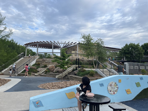 Great, all-abilities park with two play structures, family restrooms, regular restrooms, water fountain, covered pavilion, park benches, and more! There's so much to do at this park, and this particular area is very baby/toddler/special needs friendly. The squishy ground is perfect for newly crawling or toddling kiddos, as well as wheelchair access. There's a beautiful walking trail that goes around the...