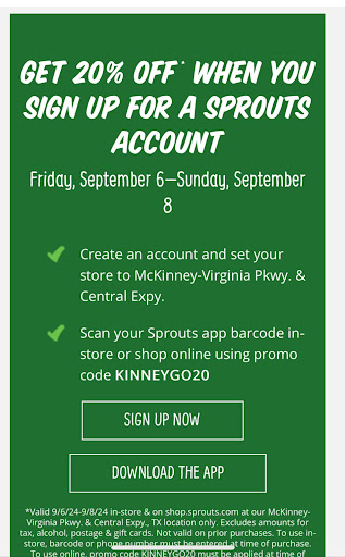 Read moreI went to the new sprouts in McKinney. The store was clean and the employees were really helpful and friendly. To be completely honest, I really didn't understand the store or why they call themselves a farmers market. When I think of farmers markets, I think of very fresh vegetables that are coming from area farmers. Everything that they had to offer vegetable wise I could have gotten at Kroger for a more competitive price. The packaging was identical to big stores produce. There's a place in Plano called Georgia's Farmers market . When you buy tomatoes for example there is dirt near the stem area. As well as any other vegetables that they sell. You pay a little extra for those vegetables but it's because they actually have flavor and are not grown in a hot house. I guess that was the kind of store I was looking forward to going to. The rest of the store is really cool. There's a lot of fresh, original and organic things in there kind of like a Trader Joe's but with more variety. I'll try going back again in a few months but I honestly thought it was going to be a closer answer than driving to Plano. I still gave it a five-star rating because of how clean and friendly everybody was but, it was overpriced and really not what it...