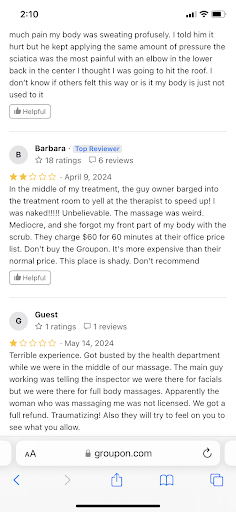 I found this business through a $59 Groupon online, and called to check availability. They advised me not to buy the Groupon because they would match the price. I agreed, and scheduled an appointment for 12:30. When I got there, no one was at the front desk, and it took a minute for someone to come running up. When I said I had an appointment at 12:30, the woman up front was perplexed and asked the other woman working that day. However, they ushered me to a room anyway. I used the bathroom and went into the room to undress and cover myself with a sheet. I then laid there for 20-30 minutes waiting for my masseuse to enter the room, even though they confirmed my 12:30 appointment. Once the massage started, there were no problems. However, maybe 5 minutes into the massage, a client walked in, so my masseuse said nothing and left the room abruptly. This was the first of about 5-7 times she left the room while I was on the table, and she left the door partially open, leaving me exposed. At one point, she also took a call. It’s important to note that this woman did not have any conversation with me prior to establish comfort and boundaries. When she returned to the room, with no warning, she pulled my underwear down, revealing about 75% of my buttocks. I was mortified, however, I’m so non confrontational that I said nothing because I didn’t want to upset her, and additionally, she spoke English poorly, so I wasn’t even sure she would understand what I was saying in the first place. The only thing she kept saying to me was “Is the process fitting you?” which made no sense to me. She focused on all of my exposed areas, including my buttocks and thighs. She repeatedly moved and lifted my underwear to get around them, and on two separate occasions, she was so far up my inner thighs that she grazed my labia. Again, I was mortified. Near the end of the massage, she had me flip over on the table, but when she came back in, she crawled up on the table (with me face up) and straddled me in order to apply pressure to my legs, which could easily have been done without climbing on top of me. At this point, she told me she needed me to leave her a 5 star review and that they would compensate me for that review by extending the time of my next massage. So, in essence, they’re buying good reviews. Finally, when the massage was over and it was time to leave, I had a hard time getting dressed because there was so much body scrub on my side, it was like dressing over sand. (I had to shower when I got home to remove all the oil and scrub). When I went to the front desk to pay, she confirmed that she was honoring the Groupon price, which she said was $68 (roughly $10 more than I would have paid to Groupon), and she advised me at this point that there would also be a $3.99 service fee for using a credit card. Had this been disclosed on the phone when I booked the appointment, I would have brought cash to the appointment. When the transaction was processing, she asked how much of a tip I wanted to leave. I said $10 (feeling like that was generous given my experience). She then said, “Oh. Usually the minimum is 20% but that’s ok.” I was livid. The service, attention, and respect I received was abysmal, and I was absolutely floored at that comment. I know that everyone has bad days, and maybe that’s all this was. Either way, I will not be going back to them or sending business their way. They say you get what you pay for, and I definitely feel like that rings true in this case. I’m not saying not to give them a chance… maybe I’m an anomaly. But, buyer beware. For what it’s worth, the place was clean, and the two women working there were friendly. That just isn’t enough to salvage my experience,...