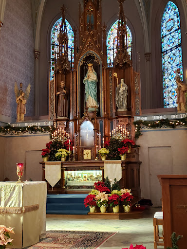 The altars are handmade of wood shipped from Germany. The carved pews, the ornate confessional, and the frames of the Stations of the Cross were mostly made by Franciscan brothers who traveled from place to place wherever the Franciscans settled to build church furnishings on site.