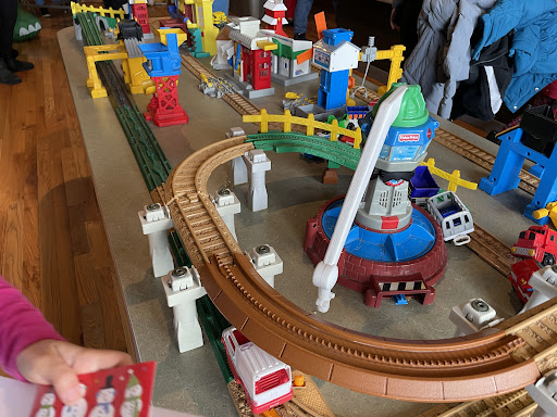 My 2 year old son loves the huge train track, the outdoor barn area with fake horses they can ride, the rocket ship with astronaut jumpsuits, and the cave with fake bugs in picture boxes.