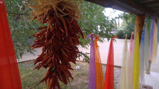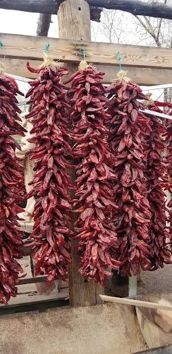 Best ristra prices in the whole state, and the prettiest ristras, too. Buy them here. All sizes, and even round wreaths and heart-shaped wreaths are here. Get the beautiful big chiles or the slimmer small chiles, both will have turned a glorious red color and are strung right. Great for culinary use as well as décor. We also get our ground red chile powder here, all four strengths (mild, medium, hot, and extra-hot). Knick knacks, statuary, keychains, minerals like amethyst and in season chile-roasting of fresh...