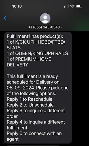 The person from the escalation team then proceeds to tell me the bed won’t arrive in the warehouse until 8/9 with delivery on 8/13. So within 20 minutes the dates mysteriously changed. I asked her why I have a text message stating a delivery date of 8/9. She said that’s just an estimate. WHAT??? It doesn’t say estimate. It says delivery date.