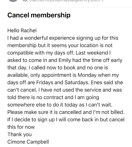 I contacted massage envy regarding the need to cancel my subscription due to traveling and not being around- after my one year contract had expired with payment always on time. I was told that I needed to go in to a location (nothing specified) and that this was the only option. I asked if they could email me docs as I am unable to go in person- they told me no.