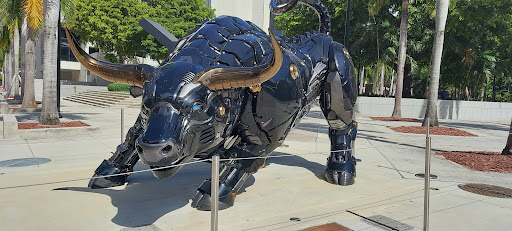 Lication to this bull was much closer than previously thought. But then again, so is everything else in this Miami area. So close that we walked by the street and did not notice it. A few more directional signs for tourists will help. Nevertheless, the bull was a cool, new, different piece of work. I was expecting NYC bull, but the only thing similar is the name: bull. This one is more like a cyberpunk, terminator type build. It was seen during the day, so the fixtures that looked to be light may enhance its view at night. It was very hot during the day, so if you go, be sure to have plenty of fluids and an umbrella to cover from the sun đ...